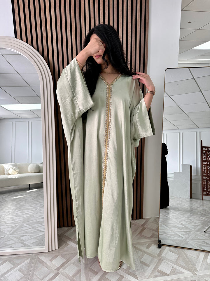 A luxurious satin kaftan in mint green with crystal embellishments.