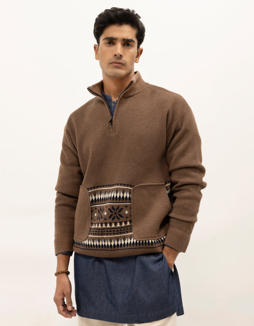 NEPTUNE B - BROWN HALF ZIP MOCKNECK SWEATER - J. Junaid Jamshed