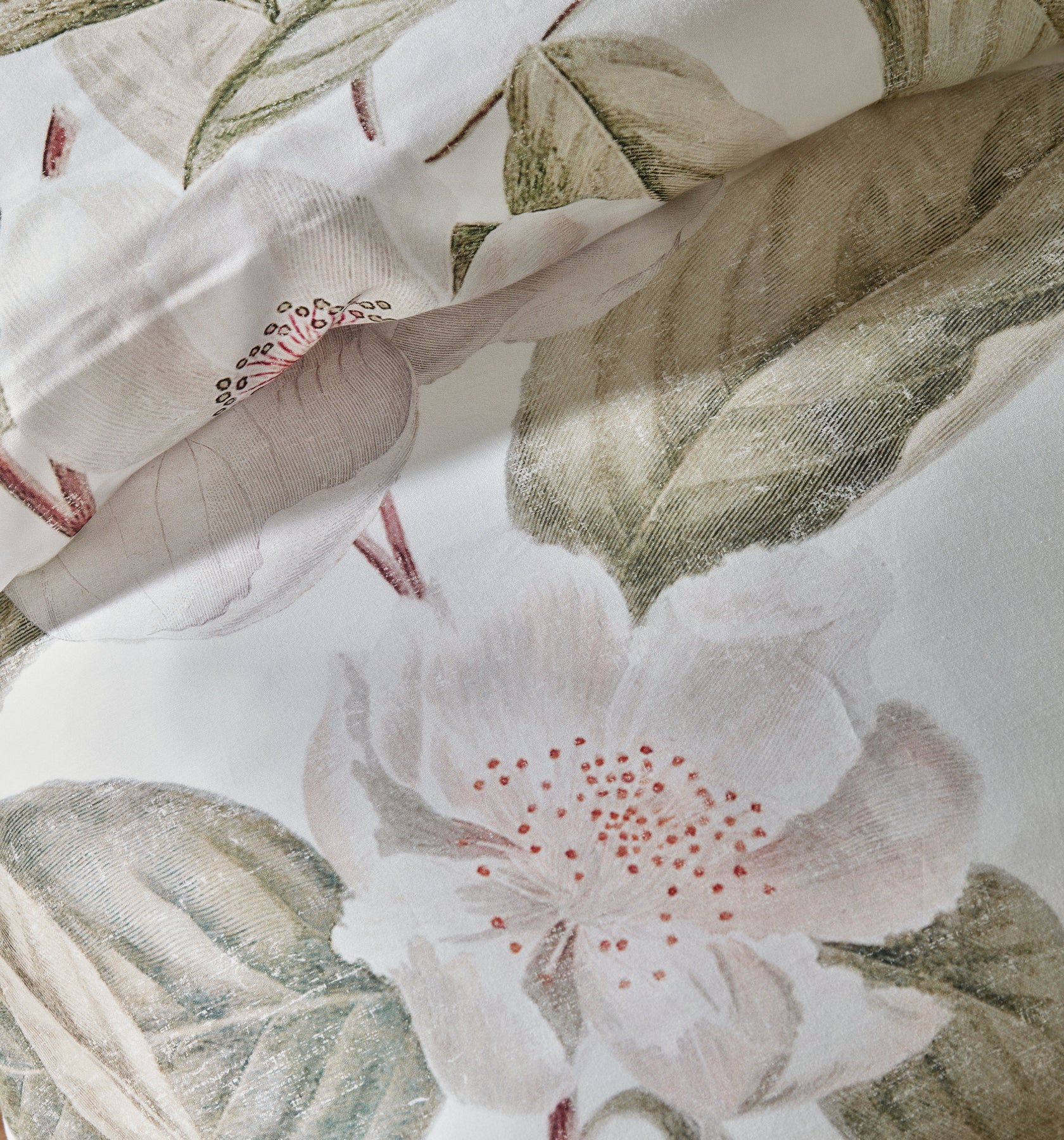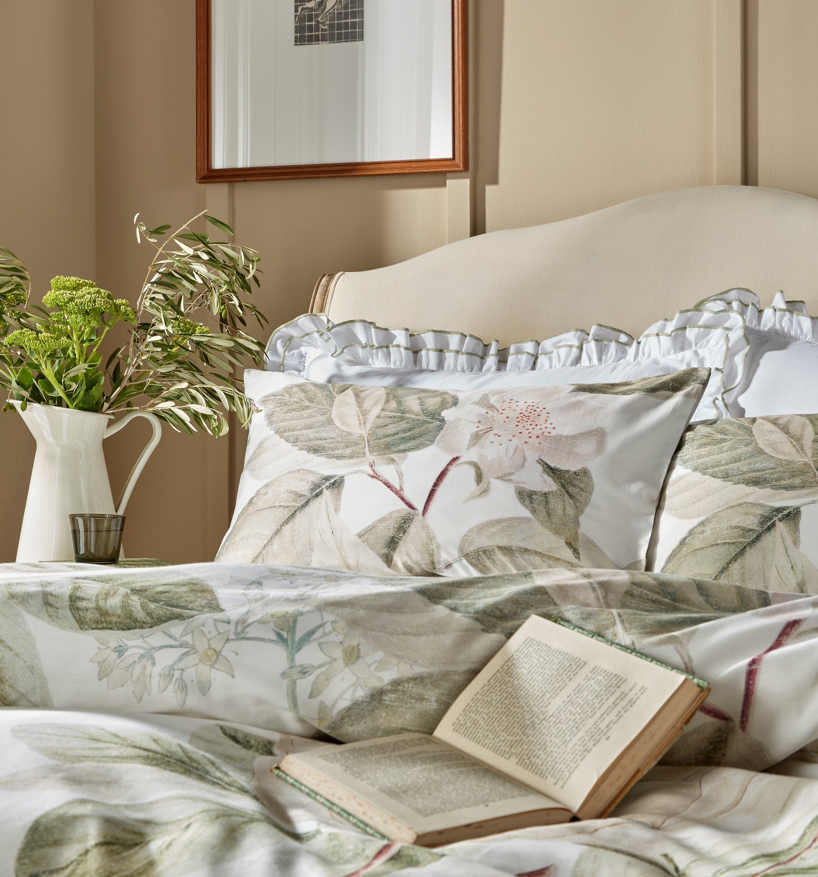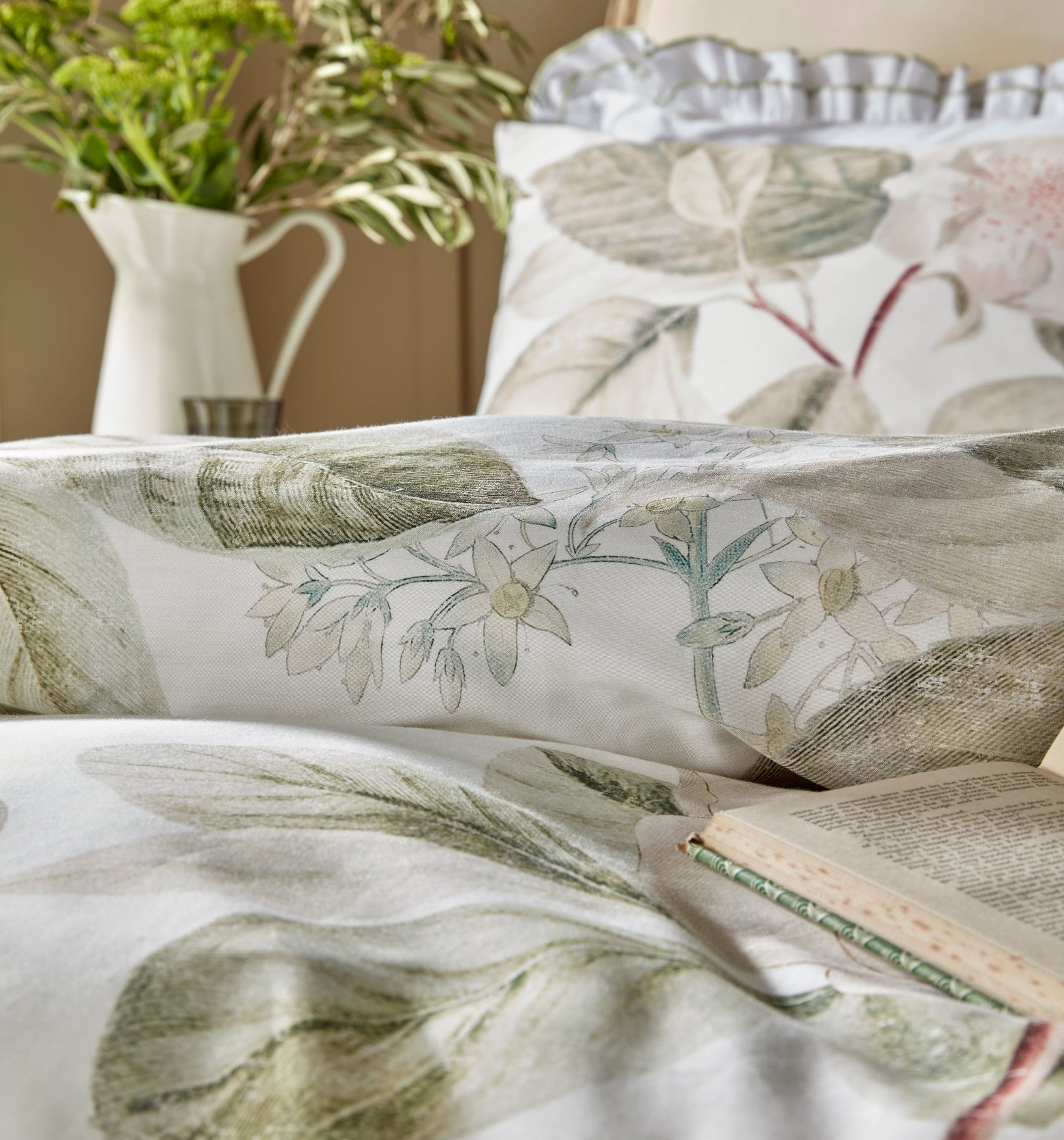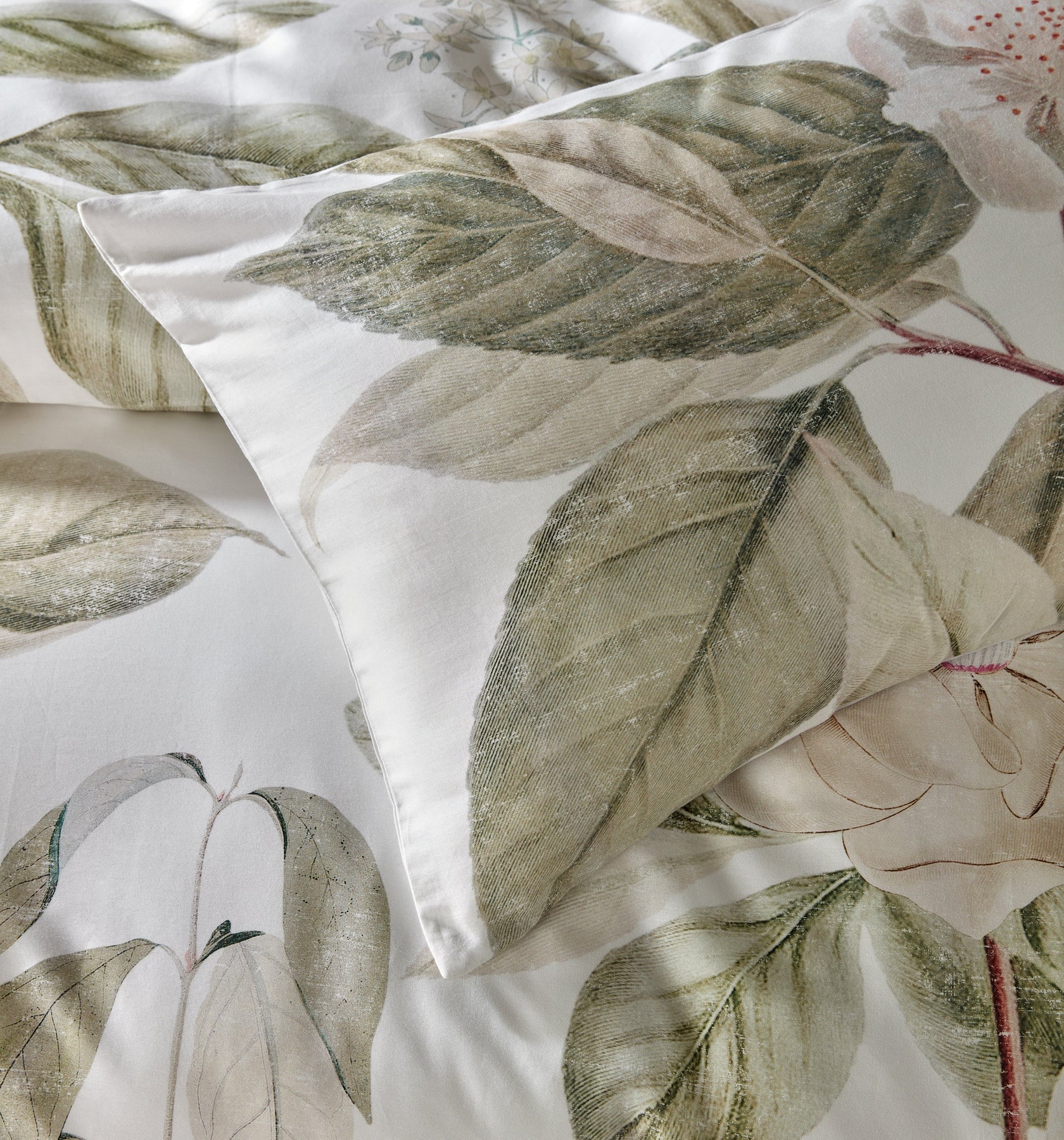 This timeless colour palette of cream & sage bedding showcases a beautiful scaled-up study of Magnolia flowers, which will add a focus point to any bedroom.