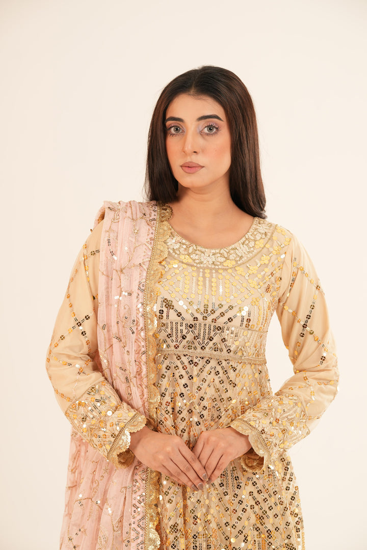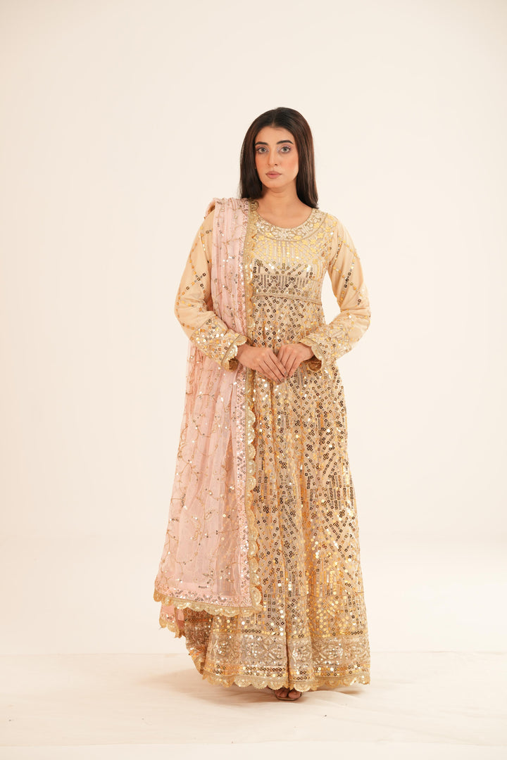 Drenched in opulence, this beige peshwas is a dazzling ode to grandeur. Designed to captivate, its heavily embroidered surface glistens with an array of 3mm, 5mm, and 9mm light and deep gold sequins, creating a mesmerizing play of shimmer. Intricate gold zariwork further enhances its regal appeal, making every detail a work of art. Paired with a plush peach embroidered dupatta that softens the radiance with a touch of warmth, this ensemble is a true showstopper for those who love to shine unapologetically.