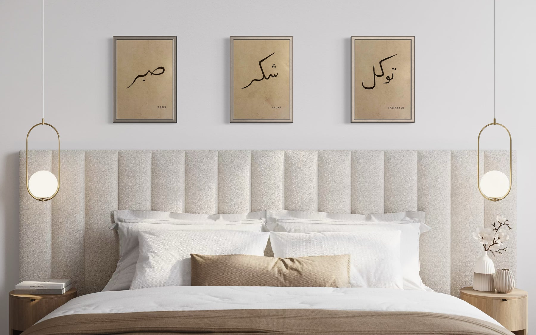 Set of 3 minimalist art prints, adding that perfect touch of character to any room, while reminding the viewer of three significant virtues; Patience, Gratitude & Faith. Soft light beige background with M Artistry’s Arabic calligraphy and english transcription. ***Frames not included***