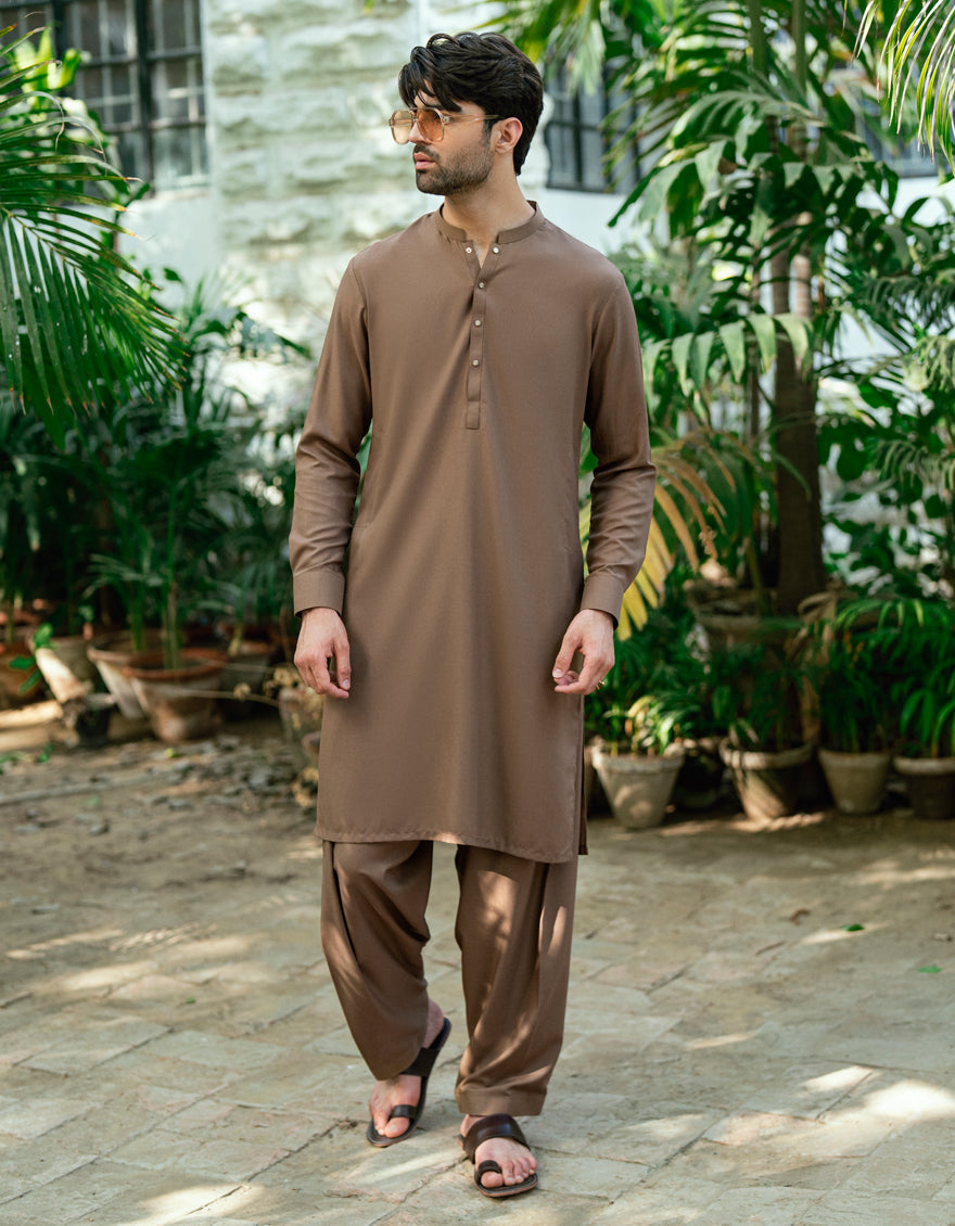 Traditional and simple, this brown blended casual kameez shalwar is made for comfortable daily wear and relaxed occasions.