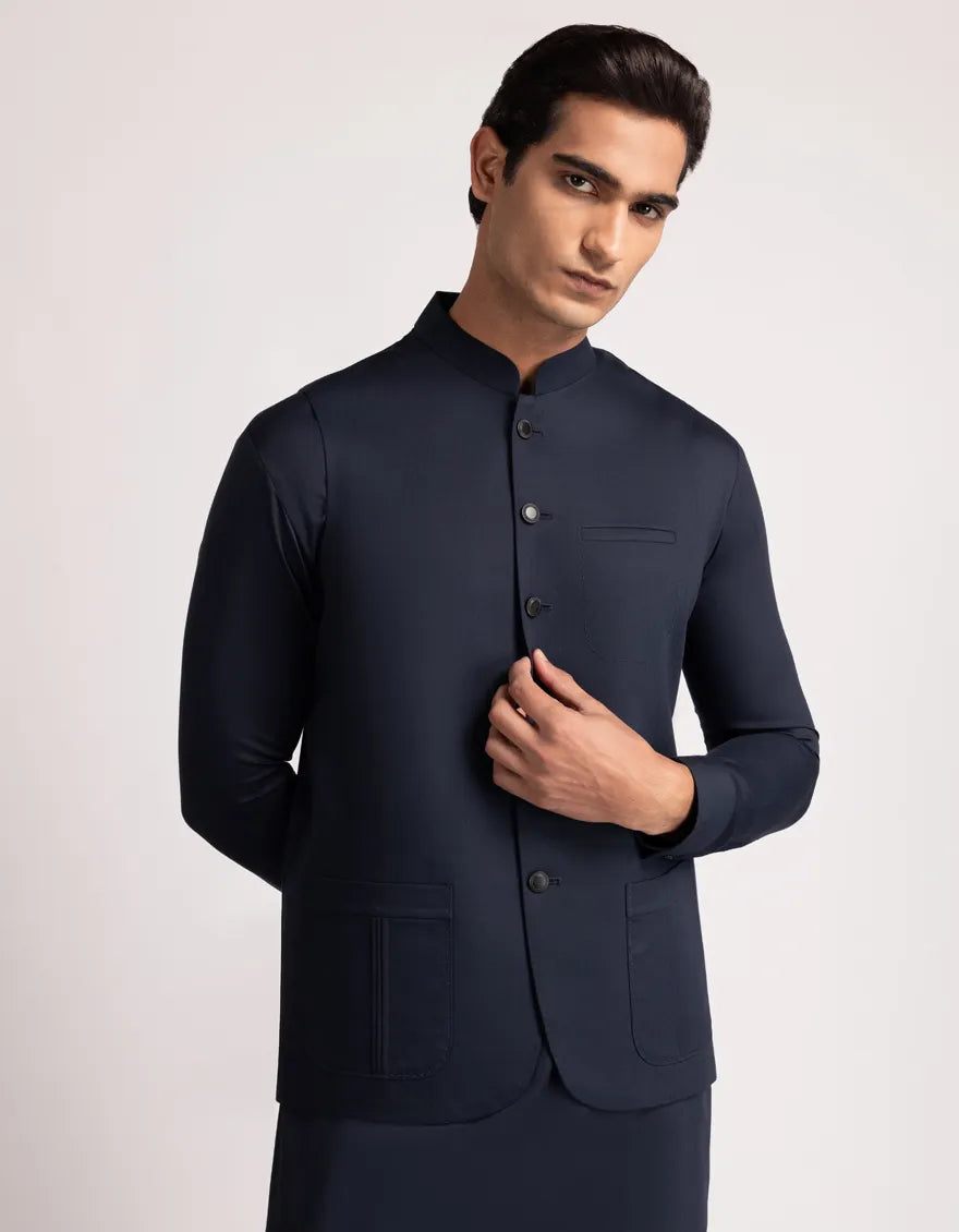 Blended Navy Blue Shalwar Kameez with Waist Coat - J. Junaid Jamshed