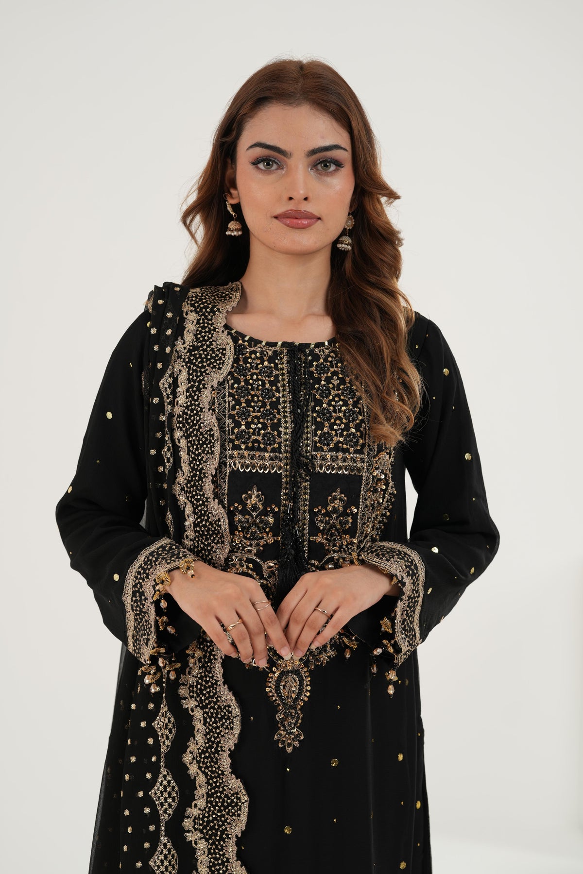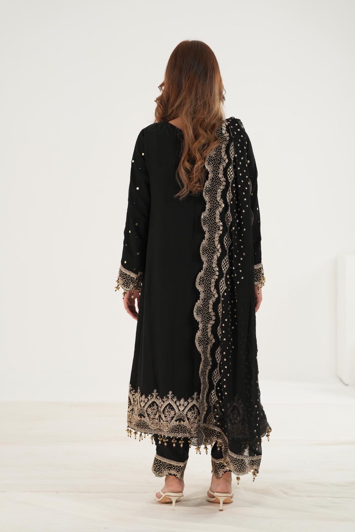 Classic black ensemble celebrates handmade craftsmanship with a front adorned in Mukesh work and gold thread embroidery. The neckline features a richly embroidered organza patch, showcasing geometric patterns with gold zari, sequins, and beadwork. The sleeves are embellished with scattered Mukesh detailing and finished with scalloped cuffs, tassels, and beadwork. Paired with trousers finished with an elegant embroidered border, this ensemble offers a refined silhouette, blending regal tradition with modern elegance