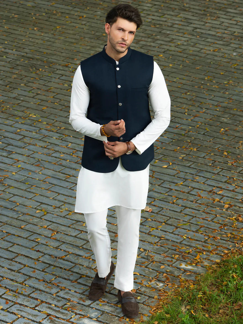 Blended Sand Kurta Trouser with Waist Coat - J. Junaid Jamshed