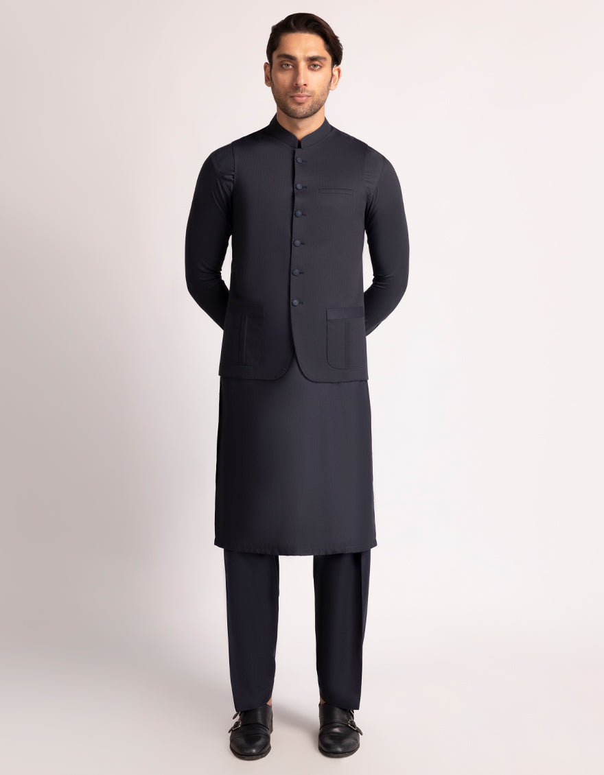 Suiting Navy Blue Waist Coat - J. Junaid Jamshed