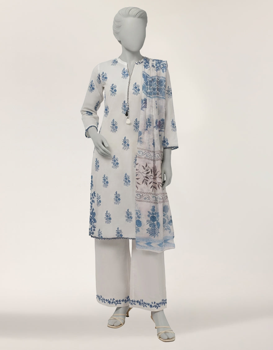 This ensemble blends classic prints with modern detailing. The straight-front printed shirt with V-slit neckline meets a dyed embroidered azar, completed with a lightweight digital print dupatta. Designed for a relaxed, long-length fit, it’s an elegant choice for everyday or festive wear