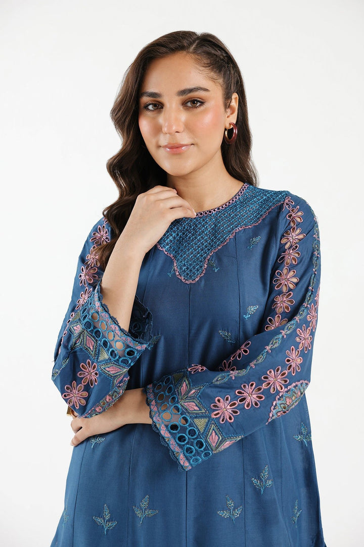 A classically rich composition is portrayed on this elegant ensemble rendered in an appealing cobalt shade. It features a mesmerizing A-line silhouette shirt beautifully adorned with intricate embroidery with floral designs and enhanced with cutwork details. Paired with a contemporary embroidered trouser, this graceful yet elegant outfit is a style statement for fun gatherings to look sophisticated this season.