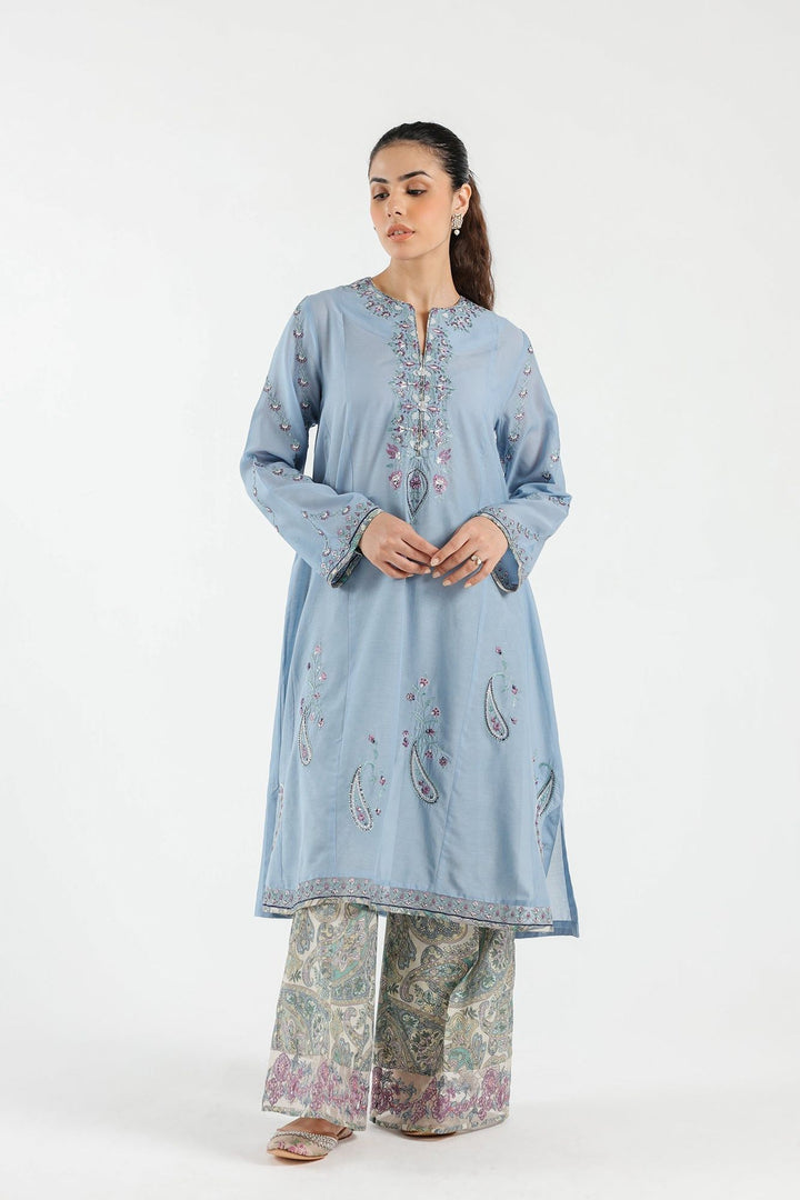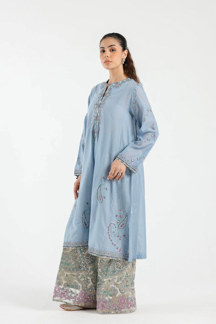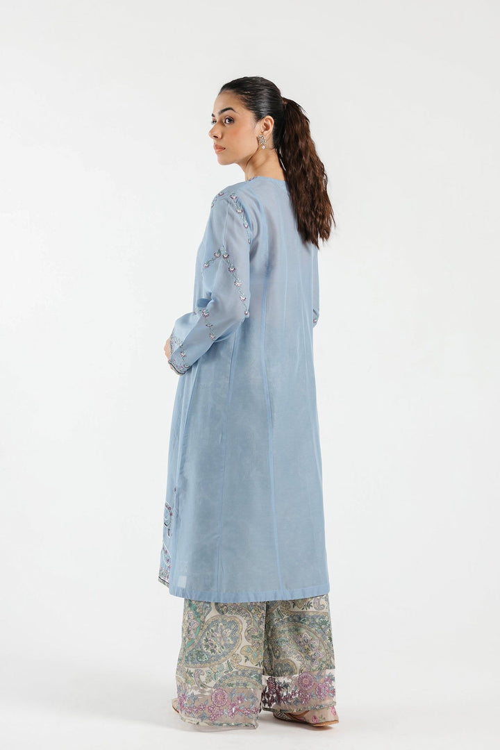 A classically rich composition is portrayed on this elegant ensemble rendered in a refreshing skyway shade. It features a mesmerizing A-line silhouette shirt beautifully adorned with intricate embroidery with floral and paisley designs and enhanced with scintillating details. Paired with a trendy flared culotte trouser with printed canvas with captivating embroidered border at bottom opening, this graceful yet elegant outfit is a style statement for fun gatherings to look sophisticated this season.
