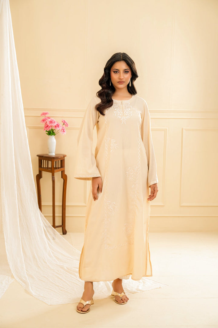 The Rafiqa Ivory Embroidered Dress captures the beauty of quiet elegance with its soft pale yellow and delicate floral embroidery. Inspired by grace and comfort, Rafiqa—which means "gentle companion" in Arabic—offers a modest silhouette with thoughtful detailing, perfect for everyday sophistication or understated festivities.