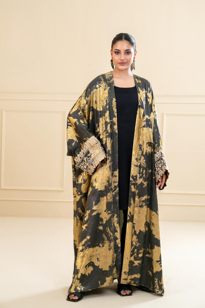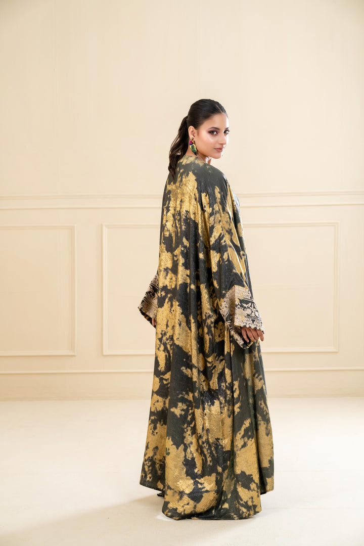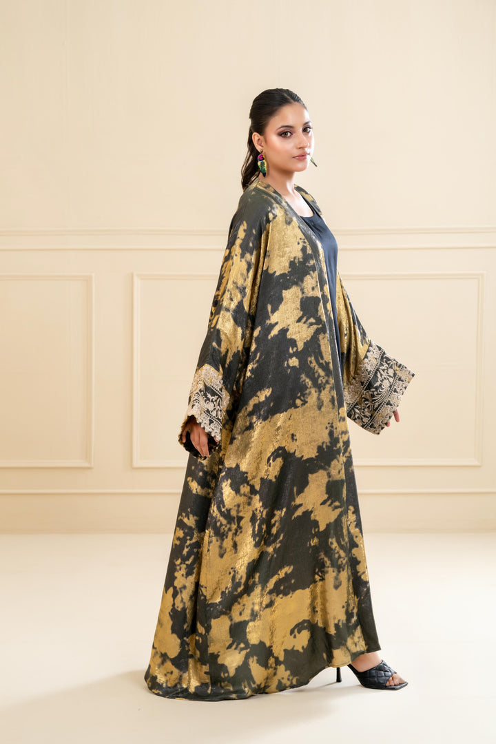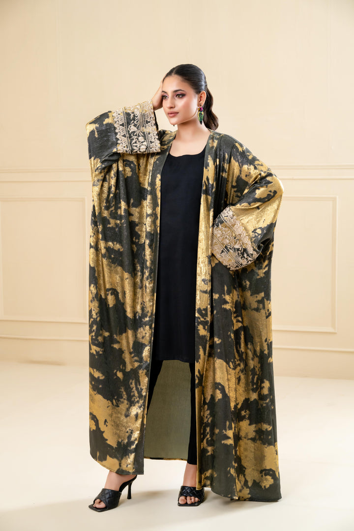 Crafted in plush crushed, this abaya flows beautifully with a voluminous silhouette that enhances every step. The exaggerated cuff sleeves are delicately embroidered in golden threads, adding a regal contrast to the artistic base print. Whether styled for Eid evenings or a special gathering, this piece promises head-turning sophistication.