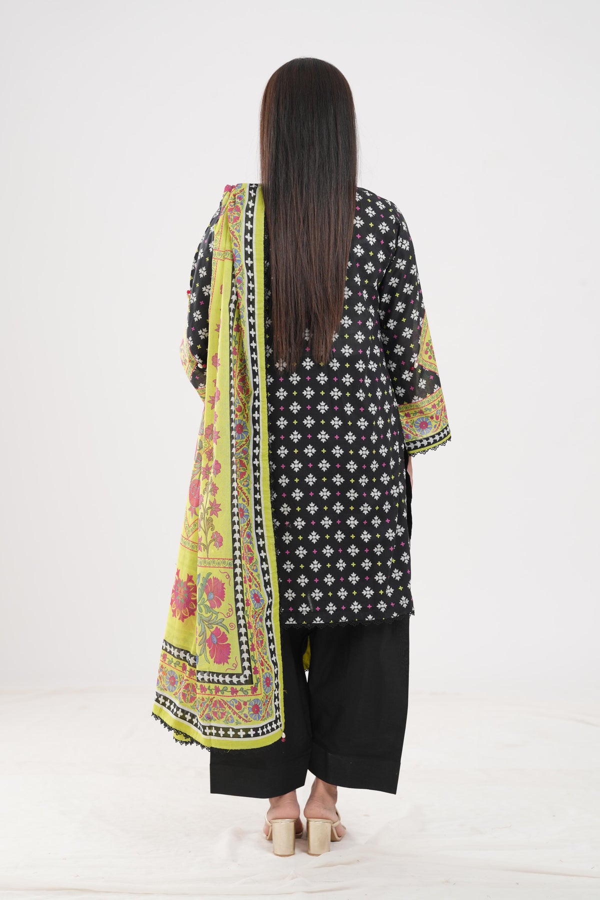 3 Piece Printed Lawn Shirt Shalwar Dupatta in Black Color