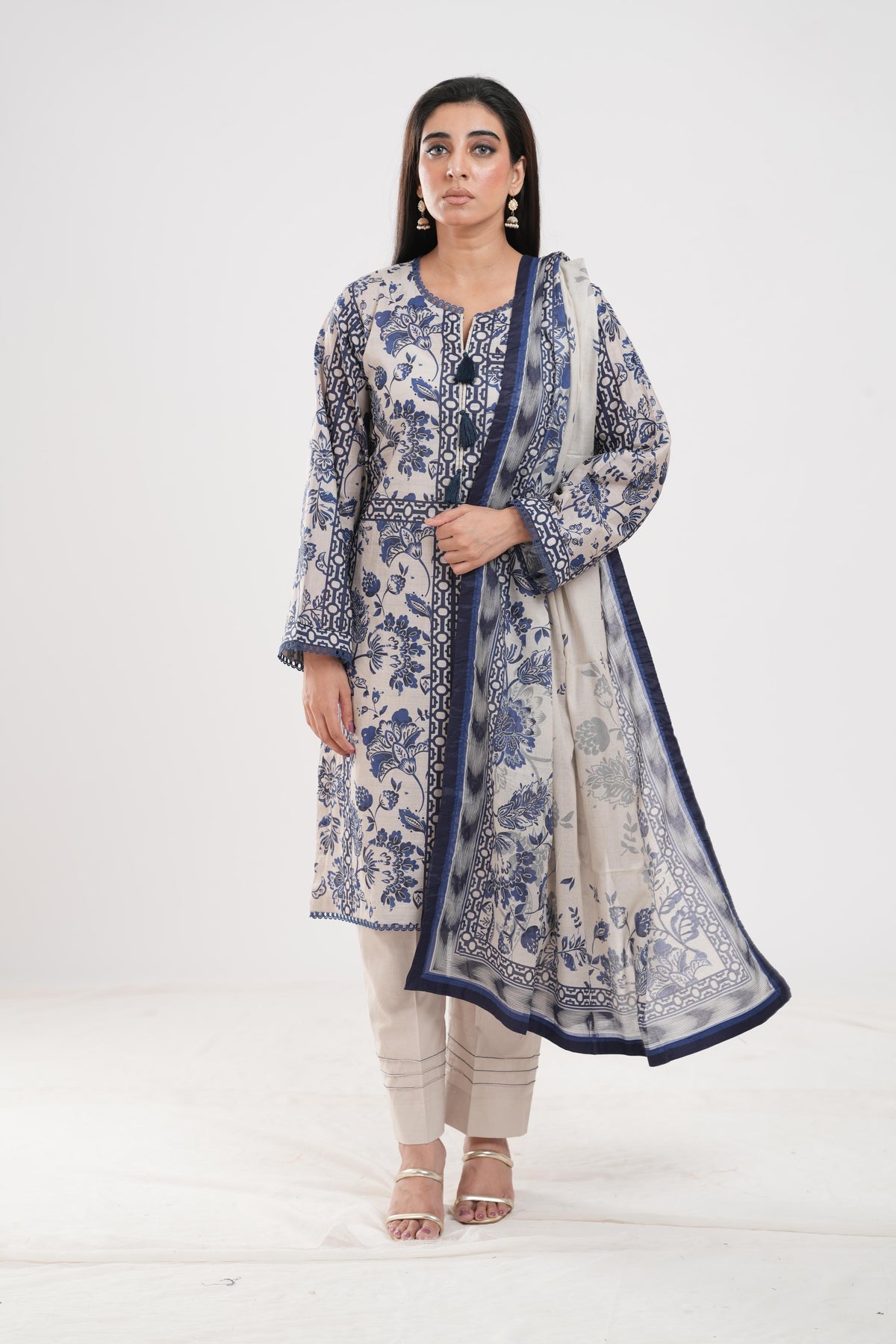 3 Piece Printed Lawn Shirt Shalwar Dupatta in Cream Color