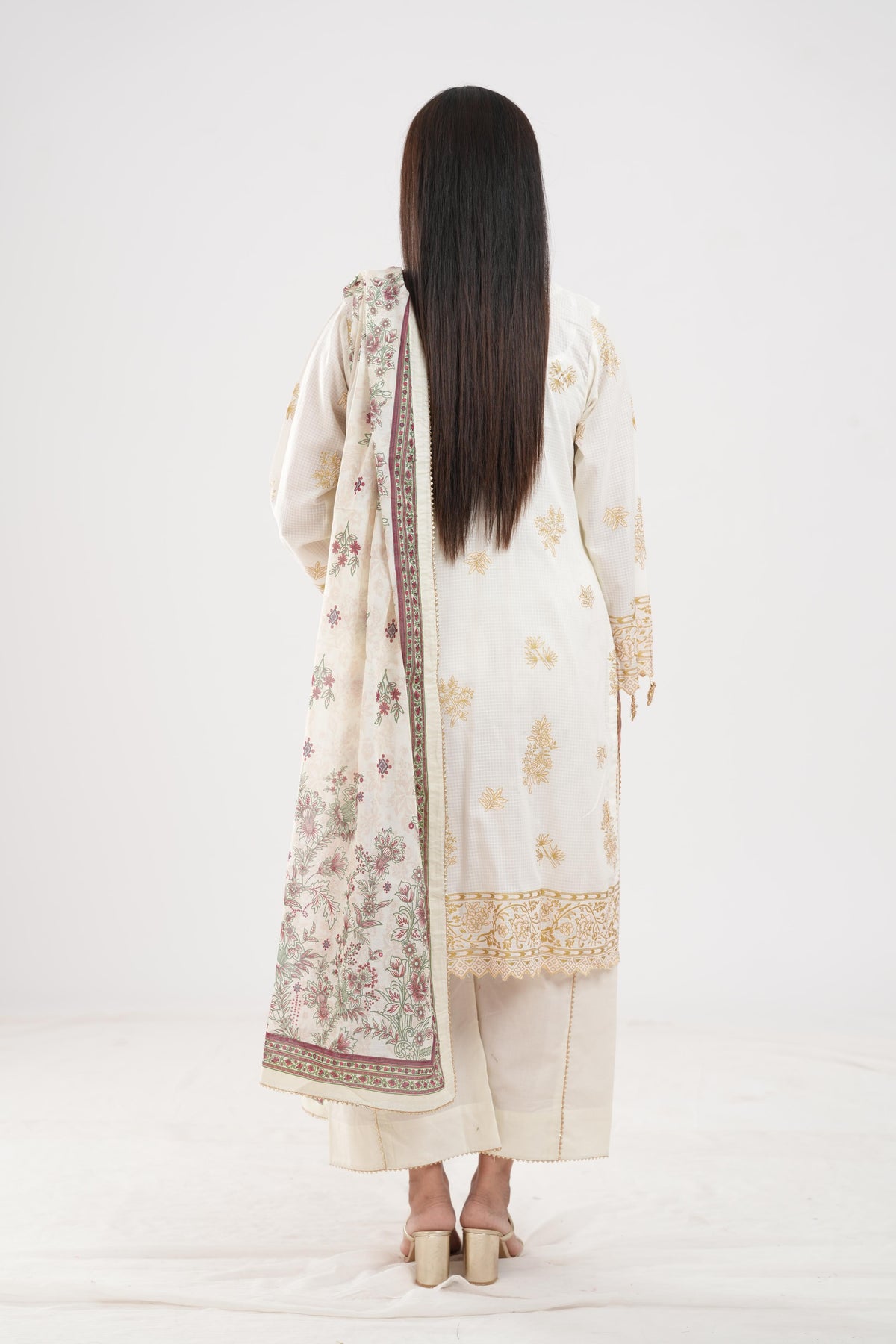 3 Piece Printed Lawn Shirt Shalwar Dupatta in Beige Color