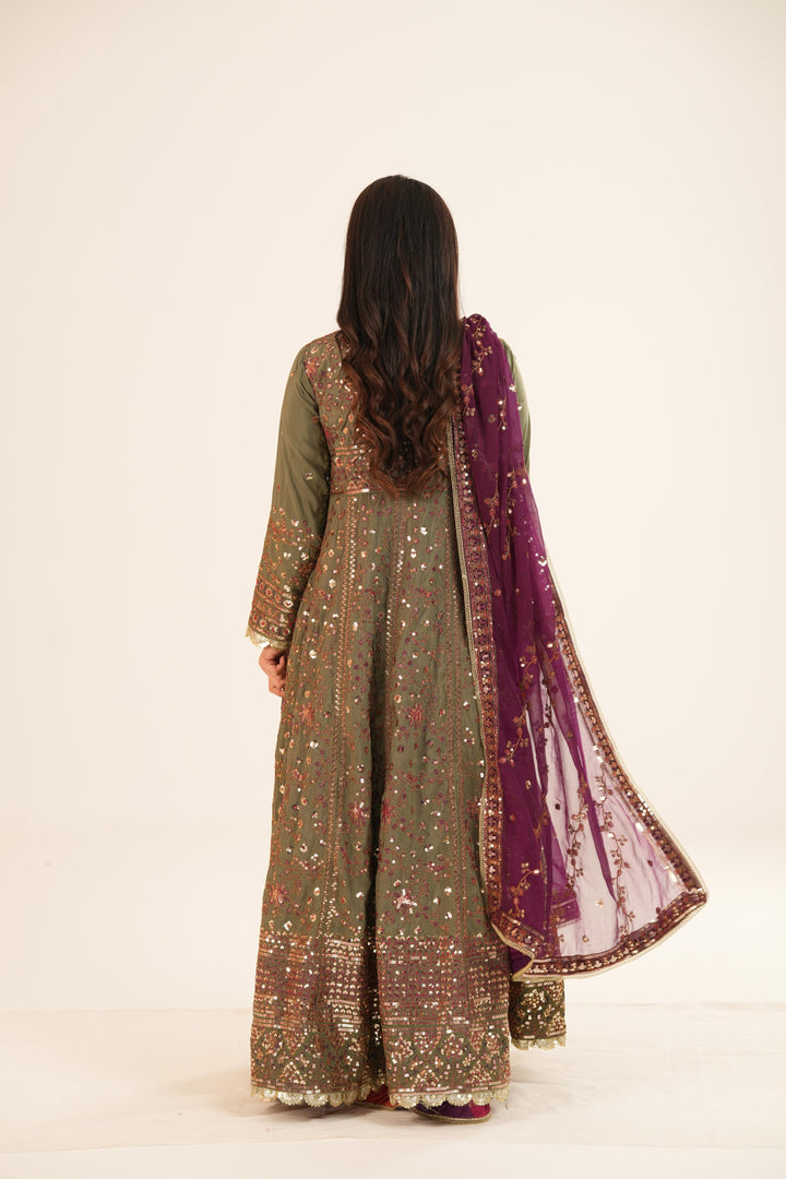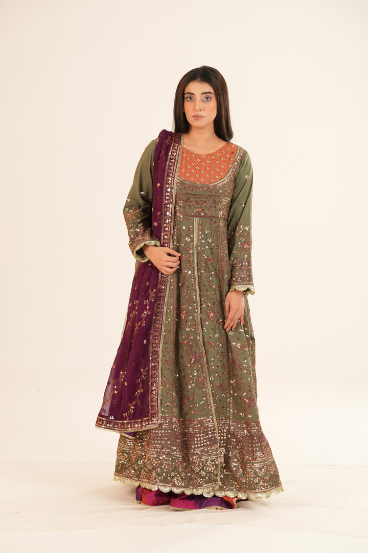 A vibrant fusion of colors and textures, this ensemble brings together tradition with contemporary aesthetics. The green embroidered shirt is adorned with magenta and rust threadwork, while 5mm gold sequins and two-toned antique gold zari lend a lustrous depth. The front bodice features a rust inner embroidered with delicate motifs, adding a layered dimension. Paired with a striking purple embroidered dupatta and pink-and-multicolored printed trousers, this look is a bold expression of artistic finesse.