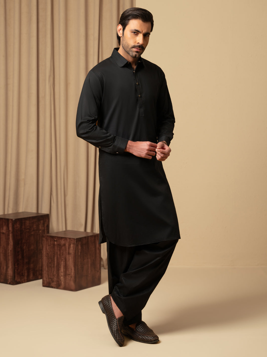 Black Kameez Shalwar With Stitch Detail on Collar and Cuffs