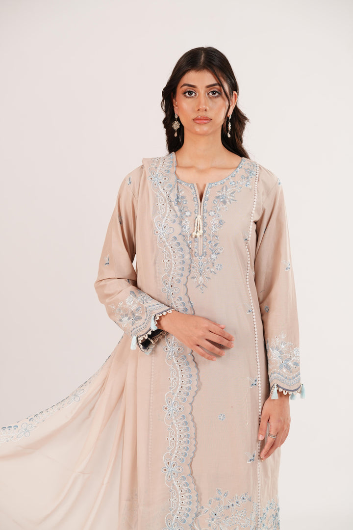 This Dusty Frost 3PC Lawn Embroidered Suit features a finely embroidered lawn fabric on the front and sleeves, complemented by a dyed back for subtle contrast. The shirt includes a delicately embroidered neckline, enhancing its refined appeal. Paired with a cambric dyed trouser, the ensemble ensures comfort and style. Completing the set is a chiffon dupatta adorned with intricate embroidery, perfect for elevating your traditional wardrobe with expert craftsmanship.
