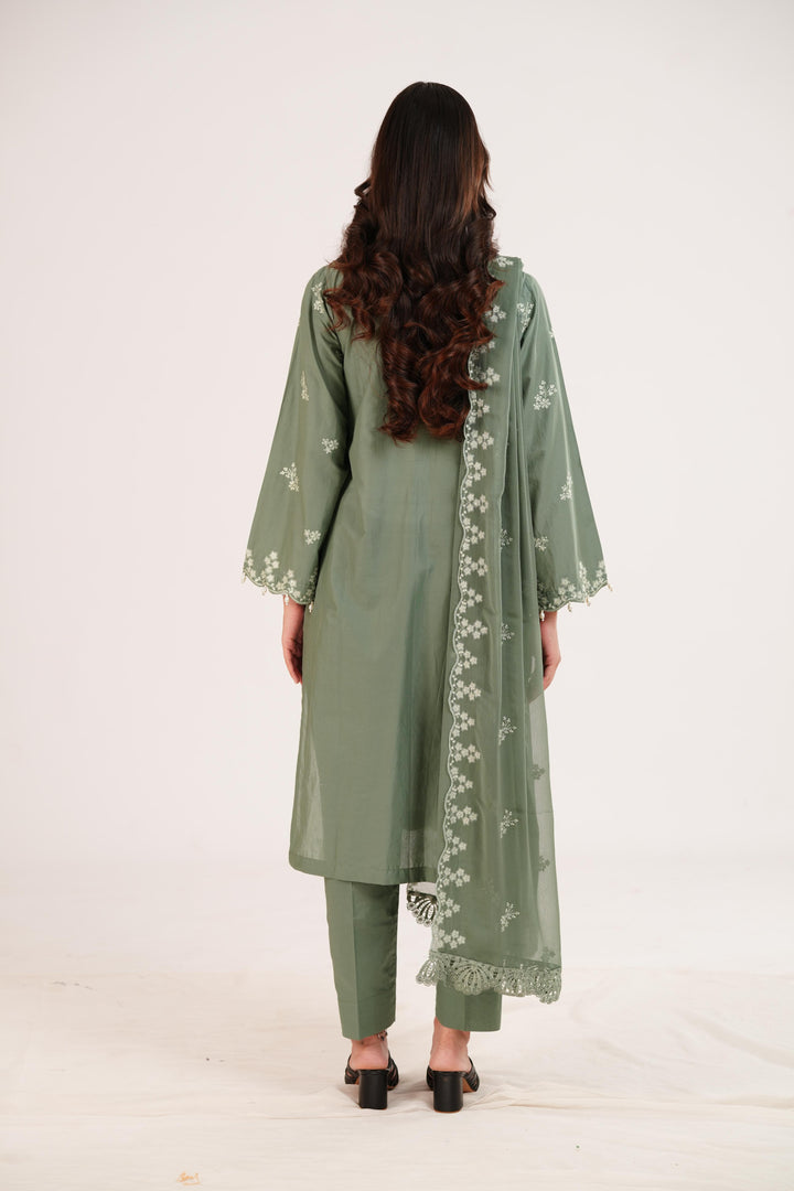 This Forest Serenity 3PC Lawn Embroidered Suit features a finely embroidered lawn fabric on the front and sleeves, paired with a dyed back for a balanced look. The cambric dyed trouser offers comfort and durability, while the chiffon dupatta is delicately embroidered to complement the ensemble. Ideal for those seeking a refined and elegant outfit with expert craftsmanship.