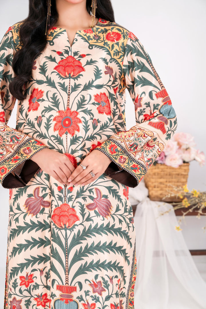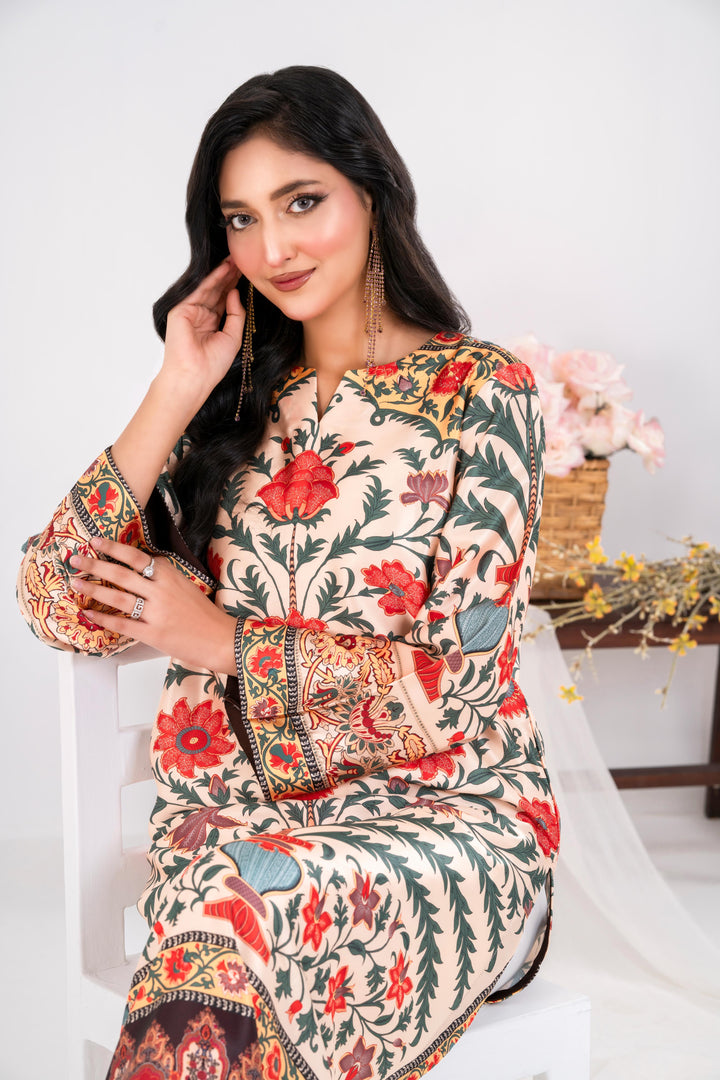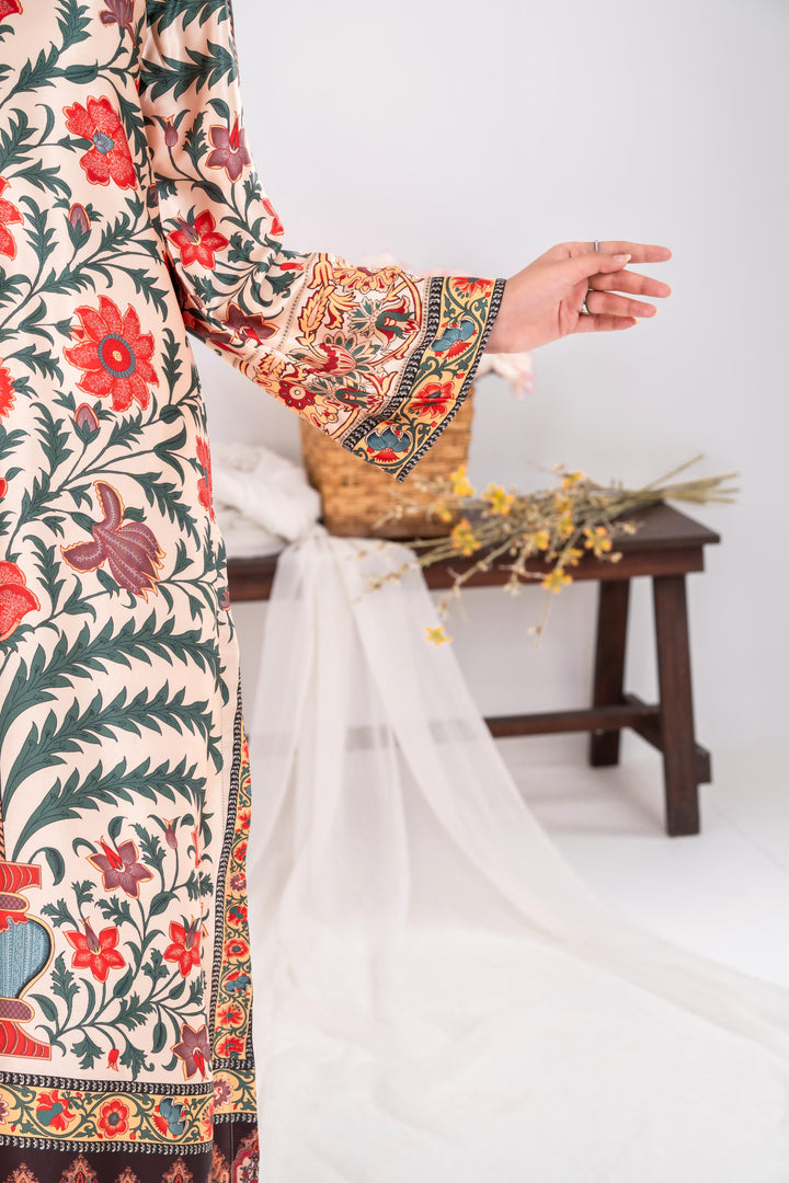 Crafted from smooth satin with a rich vintage-inspired print, this kaftan showcases a statement tapestry of florals and vines, rooted in a regal palette of terracotta, mustard, olive, and sapphire. The relaxed silhouette, soft sheen, and ornate border detailing make this piece perfect for both lounging and hosting in style.