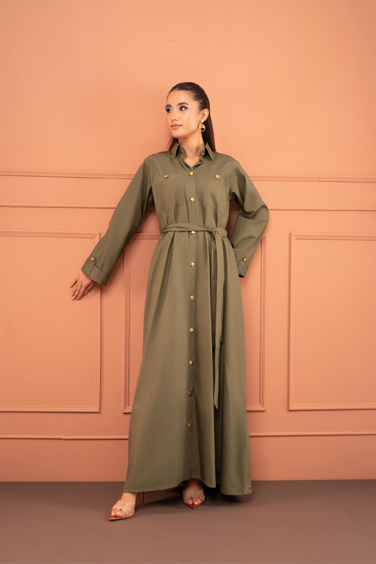 · Style: Shirt-dress cut, gold-tone buttons, collared neckline, full sleeves